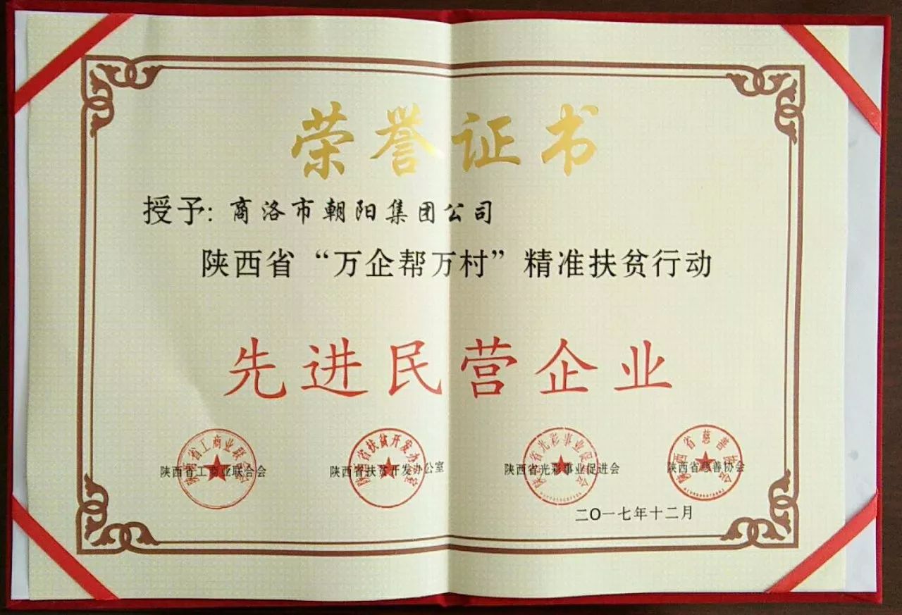 在12月19日陜西省“萬(wàn)企幫萬(wàn)村”精準(zhǔn)扶貧行動(dòng)領(lǐng)導(dǎo)小組召開的表彰推介會(huì)上,商洛市朝陽(yáng)集團(tuán)公司榮獲陜西省2017年“萬(wàn)企幫萬(wàn)村”精準(zhǔn)扶貧行動(dòng)先進(jìn)民營(yíng)企業(yè)榮譽(yù)稱號(hào),是商南縣唯一獲得表彰的民營(yíng)企業(yè)。