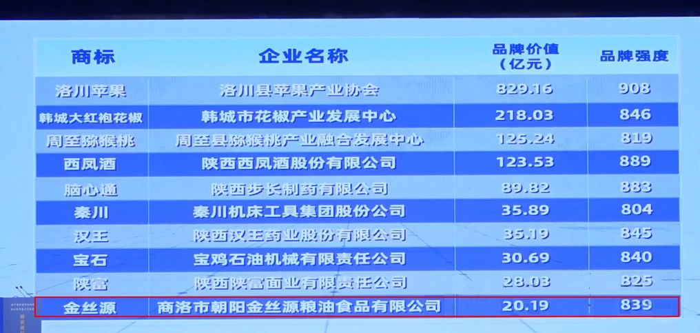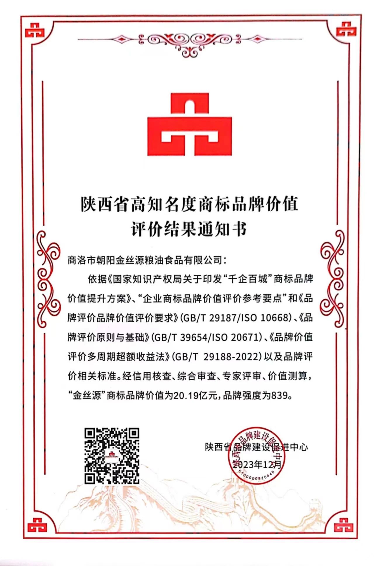 ? ? ? 近日,2023年陜西省商標(biāo)品牌發(fā)展大會(huì)在寶雞市舉行,商洛市朝陽(yáng)集團(tuán)“金絲源”商標(biāo)經(jīng)陜西省品牌建設(shè)促進(jìn)中心相關(guān)專家的評(píng)審,“金絲源”商標(biāo)位居高知名度商標(biāo)品牌榜第10位,品牌價(jià)值20.19億元,品牌強(qiáng)度839,充分體現(xiàn)了“金絲源”在商標(biāo)品牌建設(shè)方面取得的突出成就和影響力!