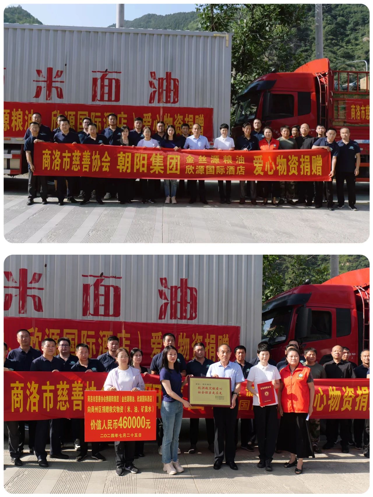 災(zāi)情發(fā)生以來(lái),朝陽(yáng)集團(tuán)董事長(zhǎng)李勝前高度關(guān)注并要求相關(guān)分公司做出反應(yīng)拿出方案,集團(tuán)黨支部負(fù)責(zé)組織實(shí)施,第一時(shí)間安排下屬企業(yè)五常東北米廠和金絲源糧油公司(商州)分廠最快速度生產(chǎn)、調(diào)運(yùn),于7月25日籌集的物資全部到位,由集團(tuán)黨支部書記、副總何方代表集團(tuán)公司將滿滿五車生活必備保障物資送往災(zāi)區(qū)楊斜鎮(zhèn),另一隊(duì)由集團(tuán)副總陳虎嘯送往硯池河村。此次共送去非轉(zhuǎn)基因食用油、東北大米、礦泉水總價(jià)值46萬(wàn)余元,切實(shí)助力受災(zāi)鄉(xiāng)親們的生活保障。